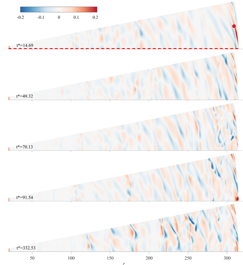基于上述过渡态动力学新特性,进一步针对封闭旋转盘腔进行了高精度直接数值模拟(DNS),捕捉过渡态流场三维演化细节。结果显示,盘腔经历转速突变后,转盘侧边界层响应迅速,静盘侧存在明显响应滞后,在高半径位置出现小尺度破碎涡并向下游传播(图3),揭示了封闭旋转盘腔内部过渡态三维演化规律与典型结构特征。