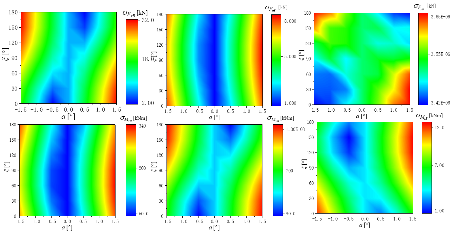 在额定工况下,叶片载荷波动标准差随桨距振幅和相位变化云图