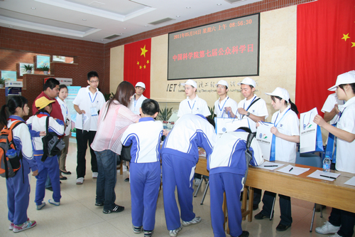 早上八点刚过,研究所的大厅里就挤满了学生,二十几名同学围在研究所大厅的展台旁一边观看一边讨论。一上午的开放时间,我们共接待了两百多名参观者,其中有华北电力大学、北京科技大学等高校的大学生,也有来自101中学、八中、海淀实验中学、牛栏山中学的中学生,还有附近几所小学的小学生及家长,甚至有些父母或者老师由于孩子或者学生有补习不能过来,他们就代表孩子过来听介绍、拿资料。