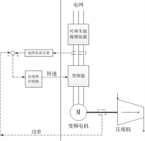 可再生能源模拟系统研究主要针对压缩空气储能控制系统的试验和测试,依据可再生能源电站的电力输出特性,建立了一套合理的电能模拟和运行控制制度,使储能系统能够高效发挥自身的储能功用,最大限度地提高联合运行的经济、技术效益。其原理如图1所示,即利用模拟系统在实验室再现电压/频率波动、电力间歇供电等典型可再生能源电网真实运行环境,为储能系统提供电能。同时根据电网负荷和压缩机部件功率差分计算结果,利用压缩机控制器和变频器实时控制压缩机负荷,实现对不稳定电能的存储利用。