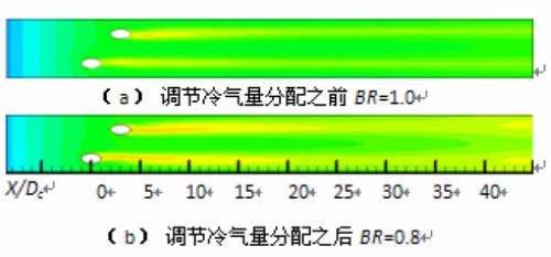 图1 调节冷气量分配前后综合冷却效率分布云图