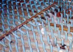 流态化就是重力与浮力作用在一大堆固体颗粒上的结果,浮力从布风板进入炉膛的风流过颗粒时对颗粒产生的曳力。为了使得供风均匀,同时要托住颗粒,在炉膛的底部要设置布风板,布风板下面接风室。布风板的基本结构是个大平板,工作条件非常苛刻。布风板的主要作用是均匀布风,使风箱中的空气从整个布风板均匀的进入炉膛,使炉膛中的颗粒均匀的流化,因此首先要均匀的布置布风板上的出风孔;同时,为了防止炉膛中的颗粒从这些出风孔落入风箱或堵塞出风孔,这些出风孔要配上风帽。早些时候,各种各样的风帽层出不穷,名称也有点搞笑:蘑菇头、猪尾巴管、T型头、扁口、柱型等等,这其中柱形风帽听上去比较中性一些。这些风帽实在不容易:既要将风室的200~300℃的预热空气均匀的导入炉膛,还要承受炉膛中850~950℃的烟熏火燎和颗粒的冲刷磨蚀;安装时可以焊接,检修时又可以方便的拆卸;既要足够坚硬,又能够承受低温与高温的双面夹击和温度的波动。感谢高温合金的研发人员,这些问题用十几年的时间逐步解决了。